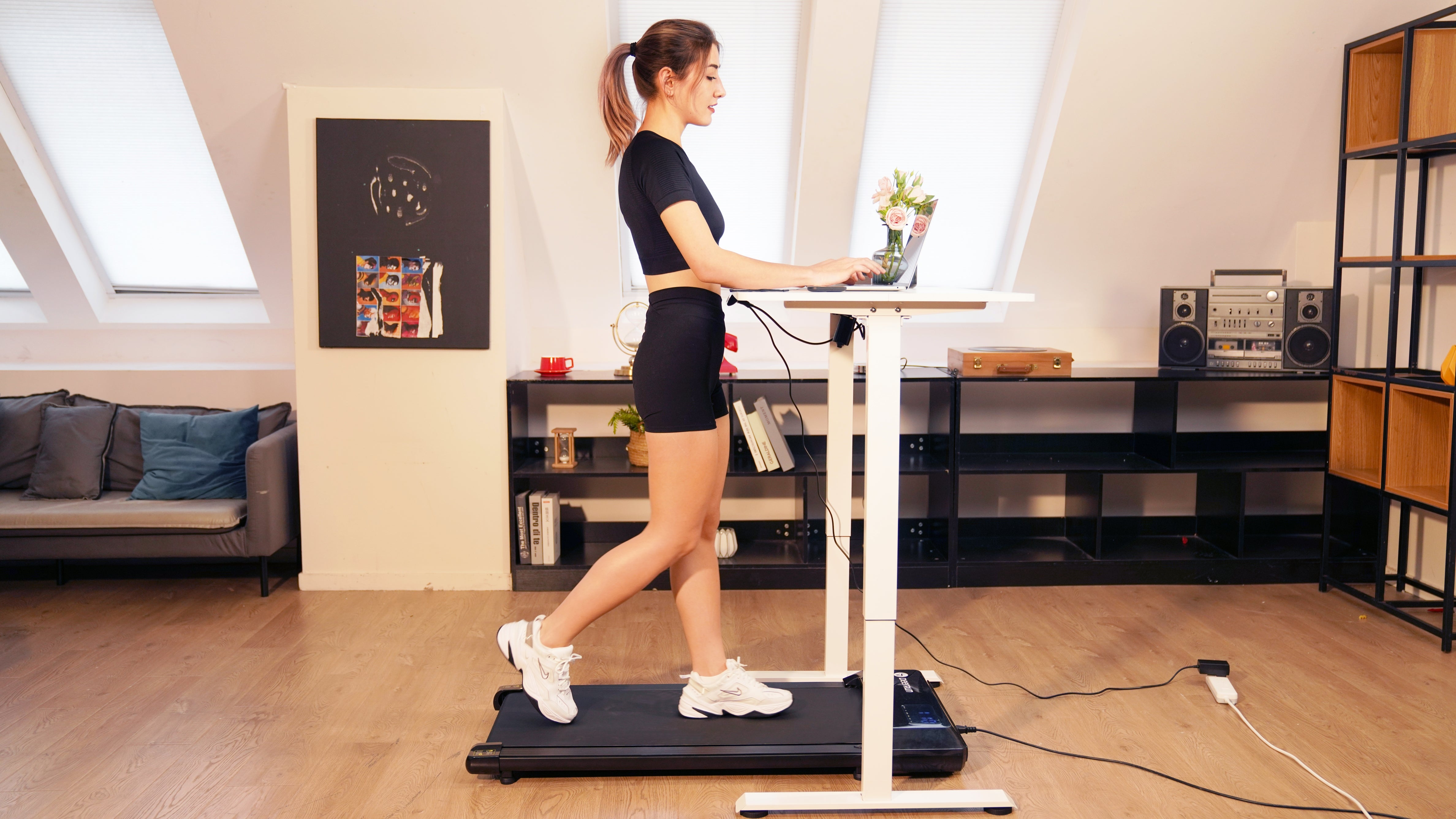 En combinant le tapis de course Q1 avec notre bureau debout haut de gamme, vous transformez instantanément votre espace de travail en un poste de marche ergonomique. La hauteur réglable et la conception robuste du bureau assurent la stabilité pendant la marche, favorisant ainsi la productivité et une bonne santé.